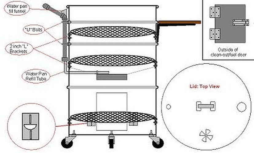 Diese Ausführung ähnelt dem Räuchern mit indirekter Hitze aufgrund des Abstands zwischen den Kohlen und den Gestellen, der typischerweise 61 cm beträgt. Die zum Räuchern verwendeten Temperaturen werden durch die Begrenzung der Luftzufuhr am Boden des Fasses und die Ermöglichung einer ähnlichen Menge an Abluft aus den Öffnungen im Deckel gesteuert. UDSs sind sehr effizient im Brennstoffverbrauch und flexibel in ihren Fähigkeiten, die richtigen Räucherbedingungen zu erzeugen, mit oder ohne Verwendung einer Wasserwanne oder Tropfschale. Die meisten UDS-Erbauer/Benutzer würden sagen, dass eine Wasserpfanne den wahren Pit BBQ-Charakter des UDS untergräbt, da die Tropfen des geräucherten Fleisches auf den Kohlen landen sollten, verbrennen und einen einzigartigen Geschmack verleihen, den man mit einer Wasserpfanne nicht bekommen kann.